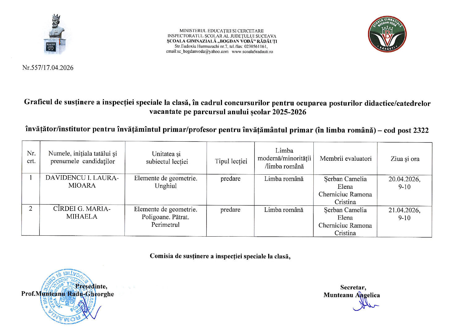 Graficul de susținere a inspecției speciale la clasă